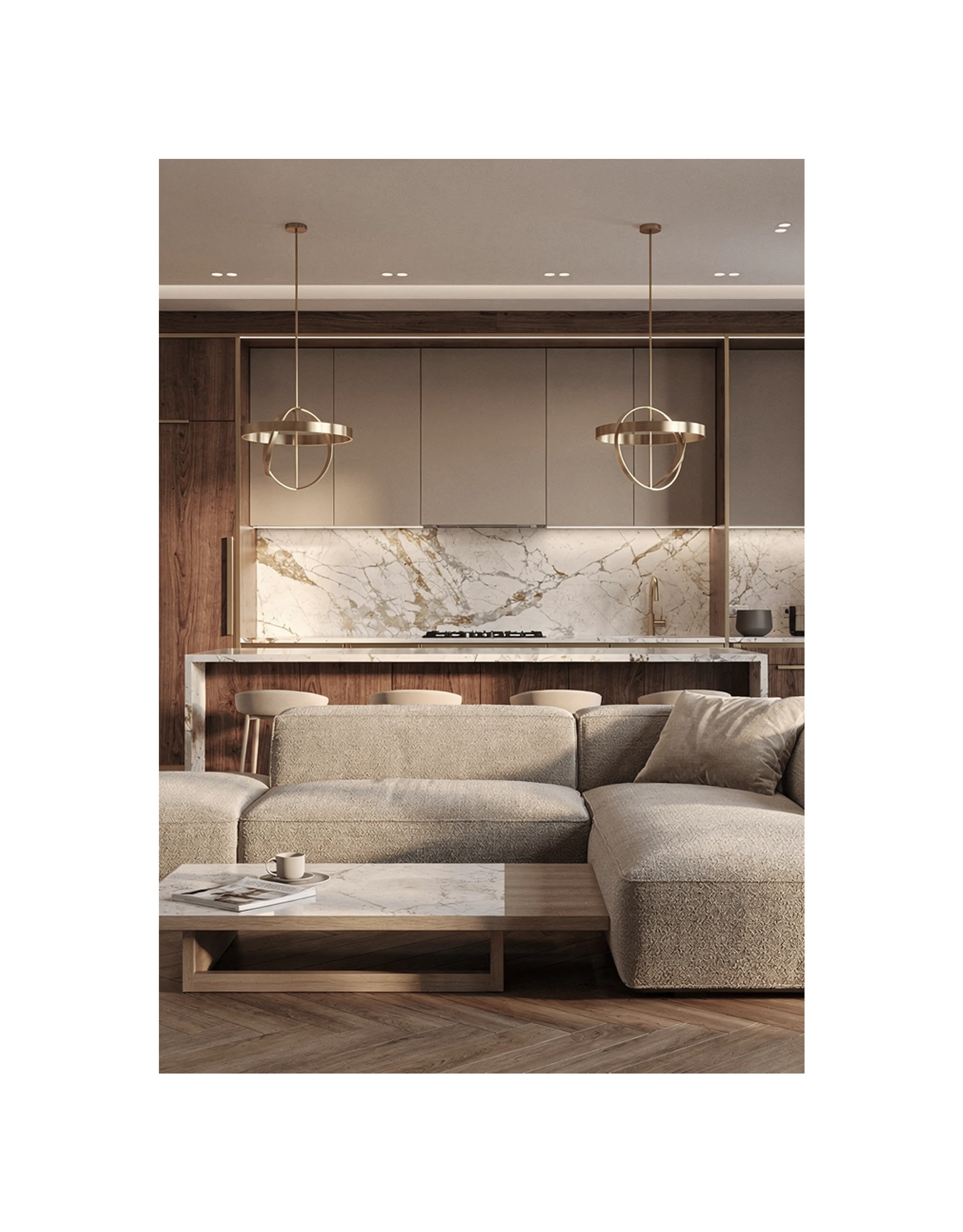 Projekt dwóch kluczowych stref w luksusowym domu w Krakowie: kuchni i gabinetu. Koncentracja na designie premium i nietuzinkowych rozwiązaniach. Estetyka spójna z charakterem rezydencji, podkreślona użyciem szlachetnych materiałów – naturalnego drewna i kamienia, a także akcentów kolorystycznych i odważnych form.